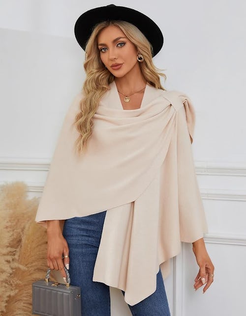 When you’re in need of something a little more fabulous than a pullover or shawl, you’ll be happy to have this sweater poncho in your closet. It’s simple yet makes you look a million bucks. The beautiful draping is created by tucking one end into a loop at the shoulder, but you can also choose to leave it open. It has earned a 4.5-star overall rating on Amazon after more than 3,000 reviews.