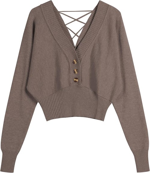 This V-neck cropped sweater has three tortoiseshell-print buttons lining the center while the back is an open V with lacing that can be tightened. The batwing sleeves add slouchy-cool vibes and give you plenty of room to move and breathe in.