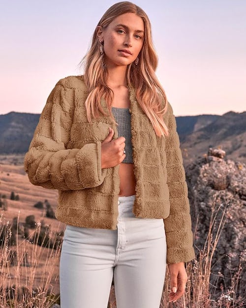 You’ll feel glamorous as soon as you pop on this faux fur jacket. It has an open front so you can still show off whatever crop top or bodysuit you choose to put on underneath.