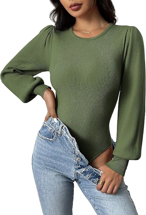 This ribbed knit bodysuit will remain perfectly tucked in whether you style it with pants or a skirt. Its material will lay smoothly on your skin with slightly puffed shoulders and lantern sleeves for a dramatic flair that will take every outfit to the next level. It snaps shut at the bottom.