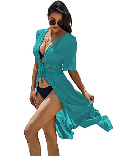 Reviewers are “obsessed” with this swimsuit cover-up, which is comfortable and elegant all at the same time. Its plunging V-shaped neckline gathers at the waist in a hollow-out pattern before billowing out into a Kimono-style skirt. It’s also made from 100% rayon, so it’s fluttery and breathable for lightweight coverage.