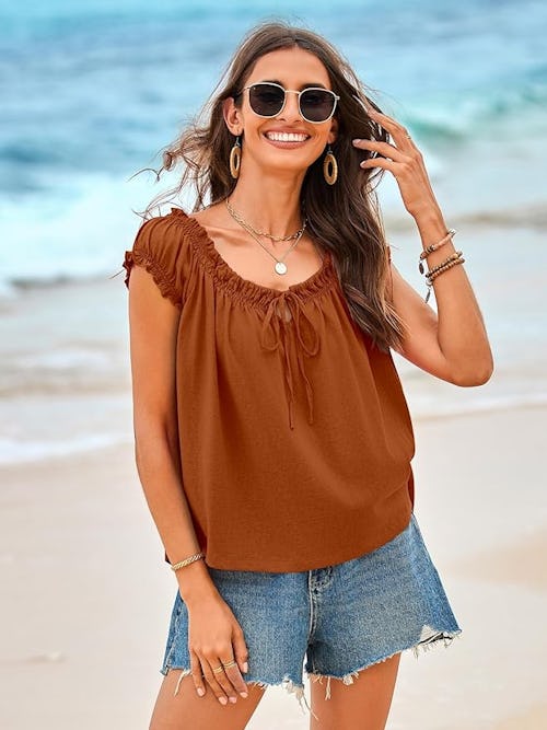 Puffy capped sleeves and a drawstring scoop neckline give this tie-front top a cottagecore feel that pairs well with everything from denim shorts to maxi skirts. With its boxy fit and flowy hem, it looks great whether tucked or worn loose. According to reviewers, the material feels “cool like cotton,” but it “doesn’t wrinkle as badly.”