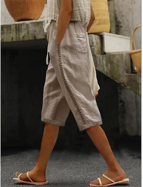 Looking for the ultimate throw-on-and-go bottoms for summer? These Bermuda shorts are made from 95% linen for an easy, breezy feel. They also hit at the knee for coverage, have a stretchy drawstring waistband for comfort, feature four pockets for storage, and have embroidered hollow-out stripes for style.