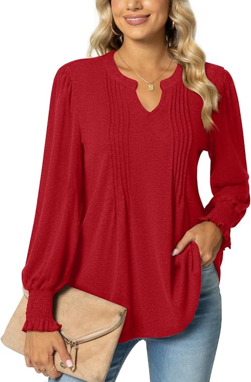 Swap your plain long-sleeve for this long-sleeve shirt, which features timeless front pleating, elastic ruffled cuffs, and a V-neck collar. The pleating gives the top a beautiful front drape, while the slightly puffed sleeves add a touch of romantic flair to your look. Choose from pretty solid colors or floral prints.