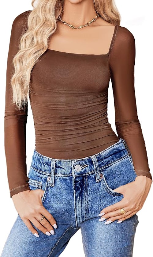 The square neckline is a trendy choice, and this budget-friendly mesh bodysuit delivers on the trend. Its soft, stretchy mesh hugs your body but stays breathable, with gorgeous layered ruching that looks more expensive than it is. It features a thong back for a seamless look under any bottoms.