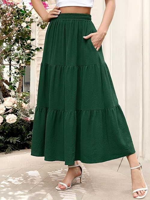 The elastic waistband of this long skirt makes it super comfortable and easy to pair with any top or bodysuit. But you’ll come for the comfort and stay for the style. Its three tiers of gathered fabric form subtle ruffles that make you feel playful. But honestly, the best part is the functional side pockets.