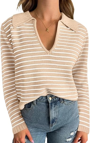Cozy and chic, this expensive-looking striped sweater is the perfect wear for chilly days. Its polo-style lapel elegantly folds over your shoulders while a deep, curved V-neck draws the eye to your neckline. A buttery-soft viscose blend and drop shoulder make this super comfortable.