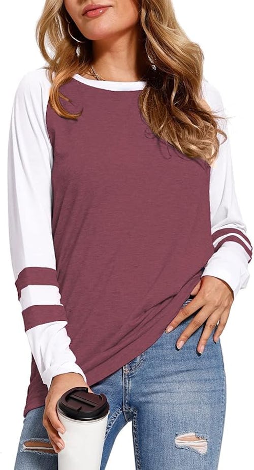 From its crew-neck cut to the stripes on its arms, this highly rated raglan T-shirt brings all the casual, sporty vibes. It’s available in multiple color combinations, and the fabric is designed to be super soft and stretchy to keep you comfy in this long sleeve. And many reviewers can’t say enough about its cozy material.