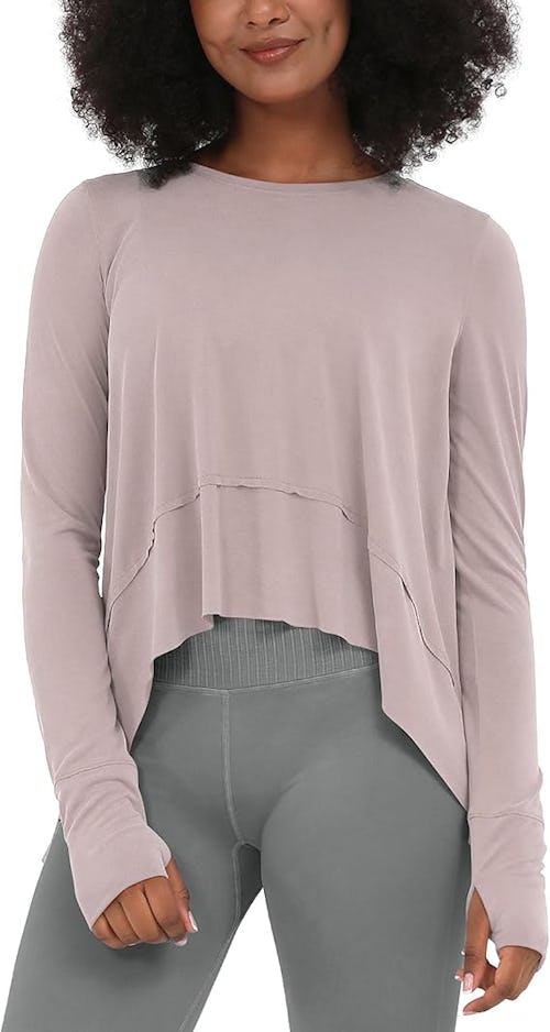 The cute cut of this high-low shirt elevates your sporty look from basic to chic. Its fabric is a soft, breathable blend of modal and polyester that’s quick-drying, so you’ll stay comfortable during any workout. Plus, its sleeves feature cozy thumbholes to prevent the sleeves from riding up. A curved seam and side slits add extra oomph.