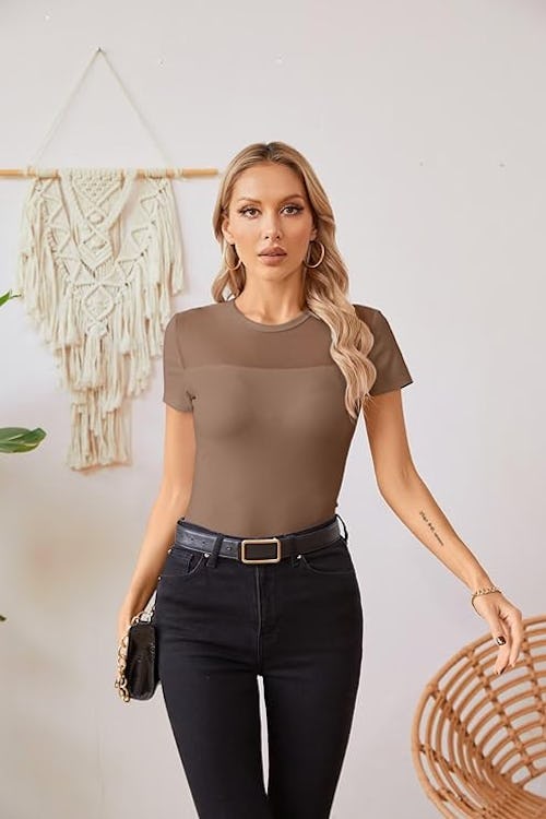 This short-sleeve top has a sheer mesh inlay that stops just above the chest and elevates it from a plain ole T-shirt to a slightly dressy one. Whether you wear it casually or dress it up, the square neckline of the sheer mesh will make you feel sexy and playful. Some colors, like black and red, look date-night-ready, and reviewers have given it a 4.5-star overall rating.