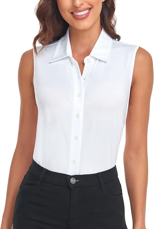 Appropriate for all kinds of styling options, this sleeveless button-down has a comfortable four-way stretch fabric and traditional collar for a polished look. Its fabric also has moisture-wicking and SPF 30 UV protection to keep you looking and feeling great on warmer days. Tuck it in or wear it untucked to highlight the curved hem.