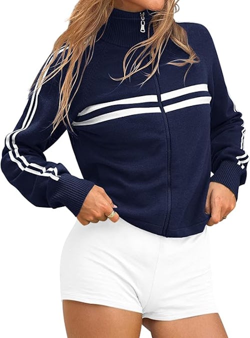 A soft viscose blend makes this knit jacket über comfortable, and its sporty-chic design makes it a fantastic addition to your athleisure lineup. Sporty stripes across the arms and chest give it a classic vibe, while pretty ribbed knit cuffs and a turtleneck collar cinch the deal with a touch of sophistication. One reviewer raved, “Sporty styling like a sweatshirt but is constructed from a soft, dense, knitted, sweater-like fabric that gives it a more elevated look. I love the close fit and the somewhat cropped length, which works great with high-waisted jeans.”