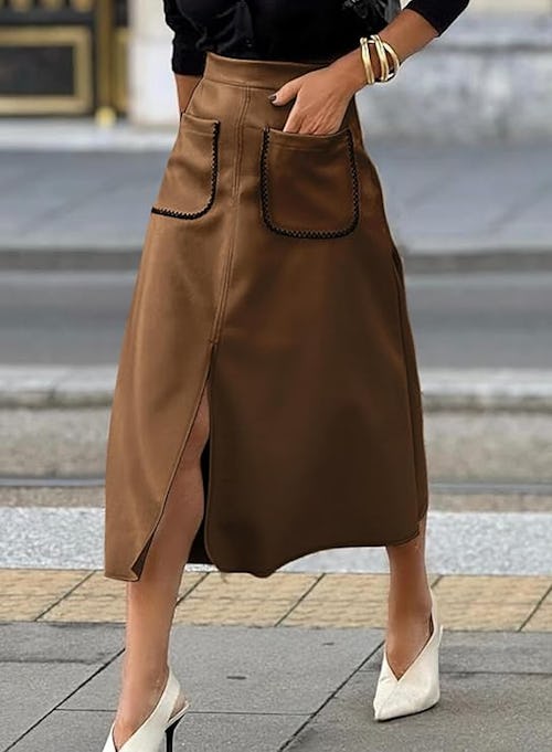 A good A-line cut is a gem for any wardrobe, and this high-waist midi skirt takes a classic A-line up a notch with an impressive faux suede material. It also has show-stopping, functional pockets with intricate black stitching. A front slit not only makes it easier to walk in but also shows a little extra leg.