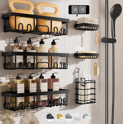 Keeping toiletries tidy is easy with this durable shower caddy set. It’s available in multiple finishes like black and gold, and it boasts a 40-pound weight capacity, so it can hold even your heaviest bottles. The stainless steel construction is durable and rust-resistant and all six pieces are a breeze to install — no hardware or drills necessary.