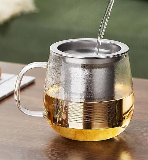 Loose leaf tea is an absolute improvement on the bagged stuff, but it can be a pain to brew; this mug makes it much easier. The outside is made of high-quality, thick glass, and on top, there’s a stainless steel infuser that sits on top so you ncan easily steep your leaves, and the mesh is very fine, so you won’t get stray bits in your brew.