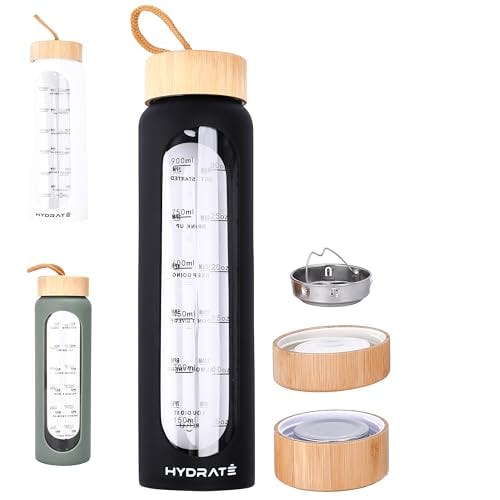 HYDRATE Glass Water Bottles 32 oz – 2 Bamboo Lids & Fruit Infuser – Insulated Silicone Sleeve – Strong Borosilicate Glass – Refillable Time Schedule Glass Sports Bottle – 11" Hx3 Lx3 W – Black