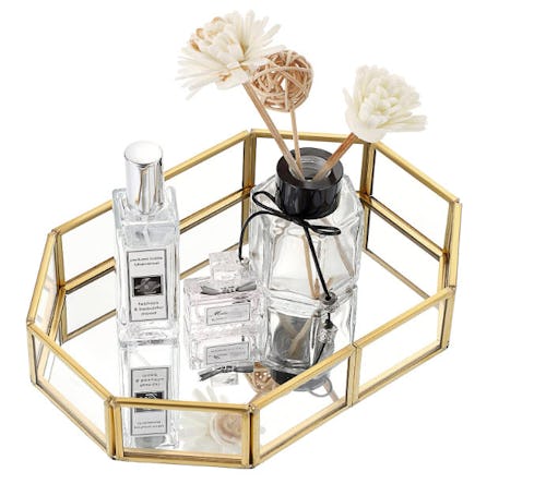 There are no qualms to be had with this classy mirror vanity tray, because not only is it functional, but it also has a high-end feel. Use it to organize your perfume bottles, toiletries, jewelry, and other small essentials. The bottom of the tray is layered with felt, which keeps it from sliding around while preventing scratches on countertops.