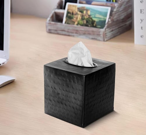 It can be hard to find a tissue box that doesn’t wobble when a tissue is pulled out, but this hand-hammered tissue box gets the job done while looking quite impressive. The high-quality metal tissue box comes in four finishes: black, antique copper, white, and pewter. An open bottom makes the box easy to refill when the time comes. Be prepared for house guests to ask you where you bought it.