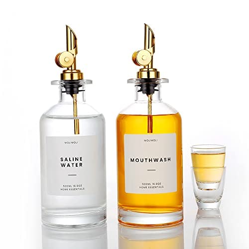 Molimoli 350ml/11.8 Oz Mouthwash Dispenser For Bathroom With Cups Reusable, Mouthwash Decanter, Mouthwash Holder, Mouthwash Bottle For Bathroom, Set of 2, Gold
