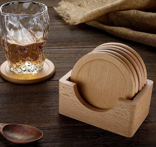 The natural wood grain on beechwood coasters makes them both stylish and functional. Six coasters come in the set along with a wood holder. The size of the coasters is great for cocktail glasses and can fit a large coffee mug. The coasters have a traditional look and appear more expensive than they are. As one reviewer noted, “They are very stylish and look good as a showpiece.”