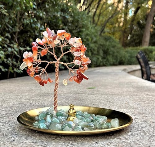 This stunning incense holder is super impressive for its low cost. An incense stick fits right into the built-in holder on the gold metal plate surrounded by small gemstones. Next to it is a healing crystal money tree that comes in a variety of colors. The plate and the stones catch the ash as it falls. The tree itself is just under five inches, making this great decor that won’t take up too much space.