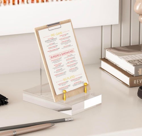 This acrylic easel display stand maximizes visibility without taking up much space, making it the perfect accessory for a recipe book, menu, photo, or artwork. The easel features adjustable gold hardware for thicker items and has four nonslip pads on the bottom to keep it in place. You can also buy the easel with silver hardware if gold isn’t your style.