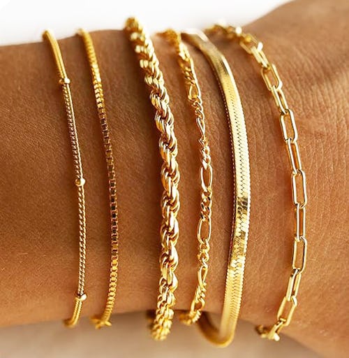 You’d never guess these eye-catching bracelets are so wallet-friendly. Made with 14-karat gold plating, each bracelet comes with a 2-inch extender so you can layer them together or wear each one solo. The set includes different bracelet styles including paperclip, satellite, rope, and box chain designs.