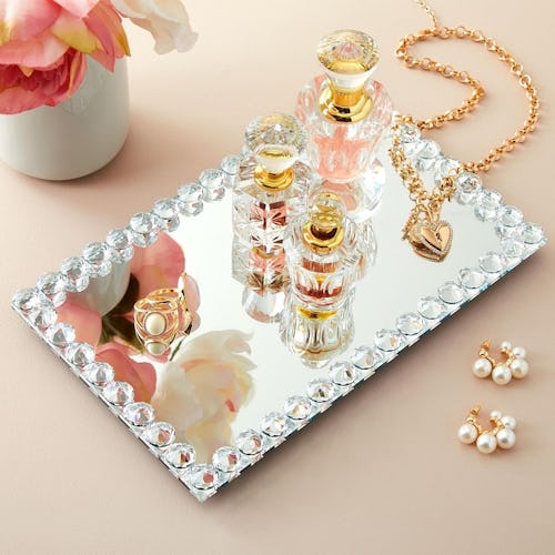 Adorned with a beaded diamond trim, this rectangular tray has a high-end look at a budget price point. Place jewelry, candles, or trinkets on the reflective mirrored surface; it’s about 9 by 6 inches in size to hold a good amount without looking cluttered.