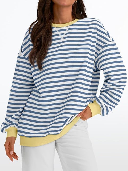 This oversize sweatshirt is super soft and comfy. It’s made from a cotton and polyester blend with details like a crew neckline, a contrasting hem and cuffs, and billowy sleeves. Pick from 18 color options and sizes small to extra-large in the listing.