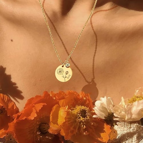 This delicate necklace features your birth month’s flower and birthstone. It’s made from high-quality brass with 18-karat gold plating that makes it tarnish resistant. The chain length adjusts from 19.5 to 21.5 inches using the lobster clasp. All months can be found in the listing, as well as a few other styles.