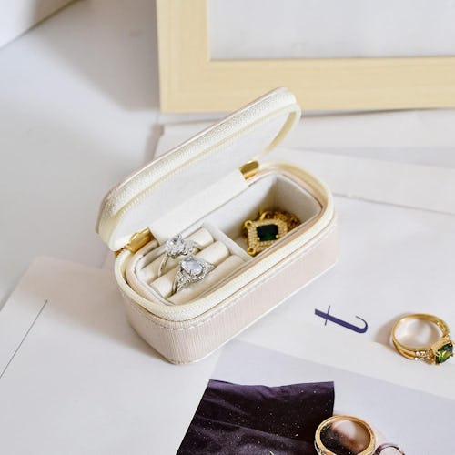 Use this jewelry organizer whenever you travel. It’s petite in size to not take up much space in your luggage, yet it has slots for two rings and a section for bracelets or necklaces. The organizer is made from faux leather with a plush lining to protect your valuables.