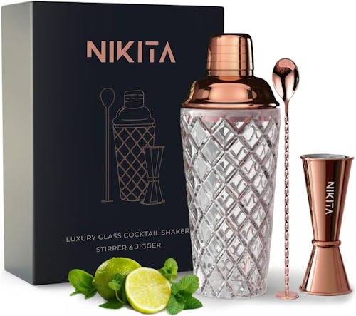 This cocktail shaker set set is pretty and practical. Included are a shaker (with a lid and built-in strainer), a stirring spoon with a muddler, and a measuring jigger to craft your favorite adult drinks. The shaker has a gorgeous textured glass body and rose gold finishes are featured throughout.