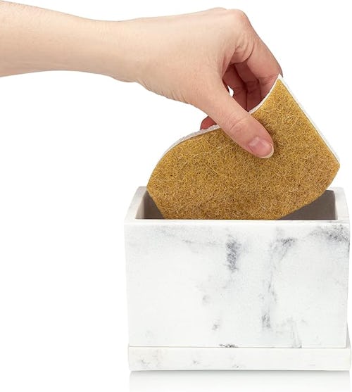 Place this sponge holder next to your kitchen sink as a more stylish way to store this dishwashing necessity. It’s made from sturdy and durable resin with a refined-looking white marble finish. And there’s a large slot in the bottom, ensuring proper drainage so your sponge gets dry.