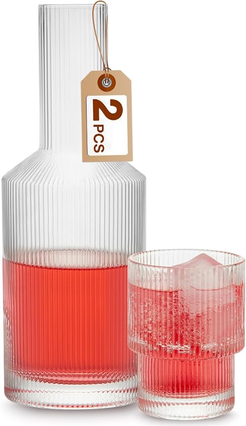 Keep this carafe set on your nightstand for middle-of-the-night water breaks. Or, some reviewers even use it for mouthwash in the bathroom or drinks in the kitchen. The glass jug holds up to 28 ounces, and the six-ounce drinking glass fits on top like a lid until you need to use it. Both pieces are dishwasher safe.