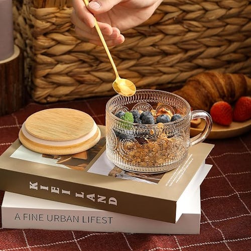 Sip your coffee in style with these four vintage-inspired glass mugs. Each embossed mug holds up to 14 ounces and the bamboo lids have a seal to keep your drink at the ideal temperature for longer. They’re microwave-, oven-, and dishwasher-safe.