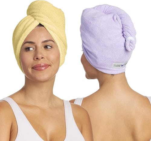 Made from plush microfiber, these towel wraps will soak up water to cut down on your hair’s dry time. They also can make your hair smoother and less frizzy. The towels twist in place and are secured with a loop on the back. Two are included.