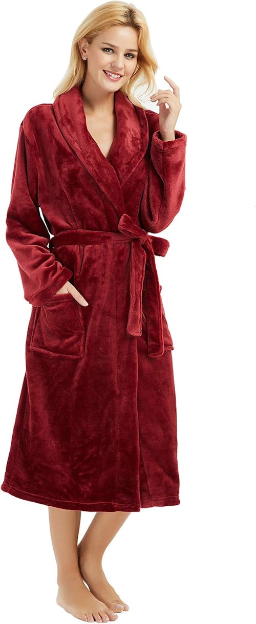Wear this long robe post-shower or even just while lounging around the house — it’s comfy in all instances. The robe is made from a luxuriously soft and plush fleece material. It has two large pockets and inner and outer ties to keep it securely closed. Consider various solids colors in the listing, including this rich wine shade.