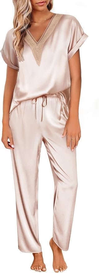 This silky pajama set is shockingly smooth and soft for all-night comfort. The top features a V neckline, lace trim, and rolled sleeves, while the pants have a stretchy elastic waistband and functioning pockets. Prints and solids are available in the listing.