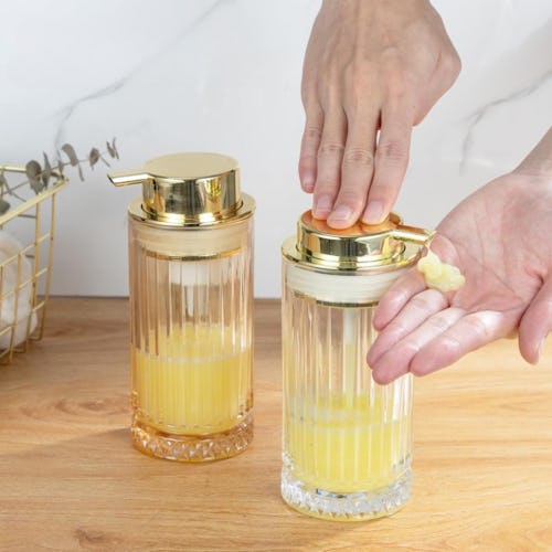 A simple swap to make your bathroom bougier? This glass soap dispenser. It has a diamond design on the base, a ribbed glass body, and a golden pump to dispense your favorite liquid soap. It holds up to 12 ounces.