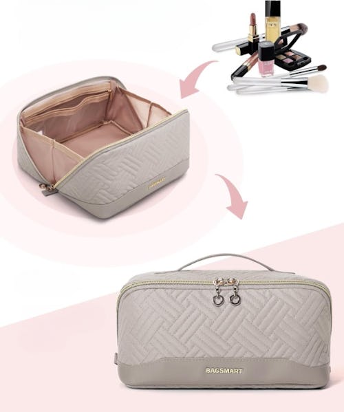 This makeup bag unzips all the way using dual zippers — the wide opening makes it much easier to spot the products you need for your look. Plus, there are various pockets inside to help on the organization front. The bag is made from a water-resistant quilted fabric with a convenient carrying handle. It comes in 10 colors in the listing.