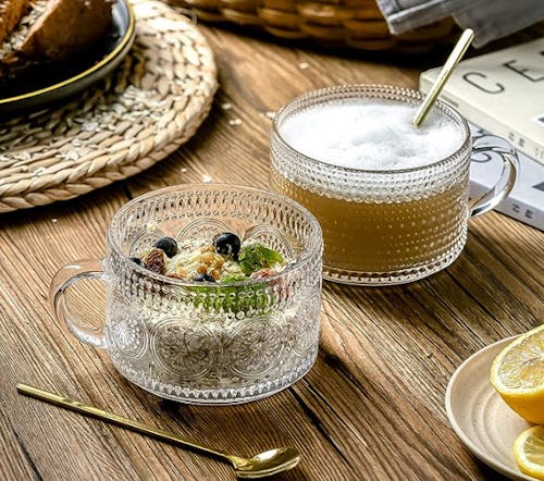 Sip your favorite beverage from these gorgeous glass mugs. They feature two intricate embossed glass designs for a real vintage feel. Plus, they stack for convenient storage. Each set includes two mugs and two long gold-toned spoons perfect for hosting tea time or gifting to your bestie.