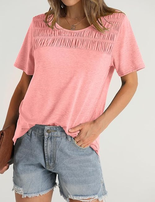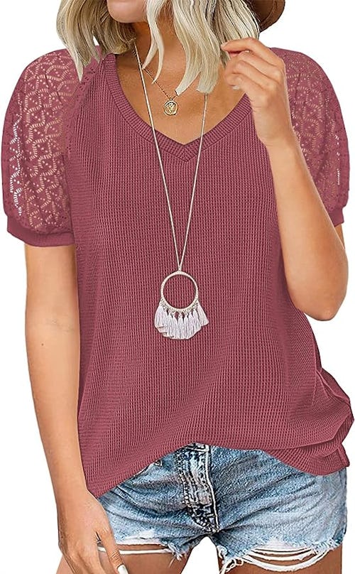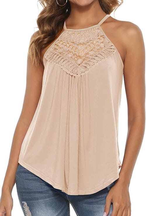 There’s more to this halter neck tank top than meets the eye. For one, its crochet panel is intricately woven with lots of little elevated details. It also has pleats for texture, a curved hemline, and a keyhole closure in the back. With over 24,000 reviews and an impressive overall 4.5-star rating, this top is a clear winner.