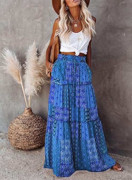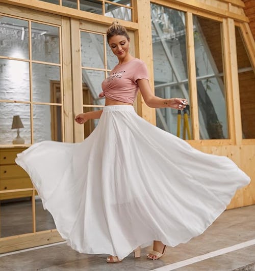 You’ll have lots of room to move and breathe in this flowy maxi skirt. That’s due in part to its stretchy elastic waist, which doesn’t cut or dig into skin. It has three tiers and a slight flare. You won’t have to deal with any zippers or hardware, either — just pull it on. It’s also machine-washable for the easiest possible clean.