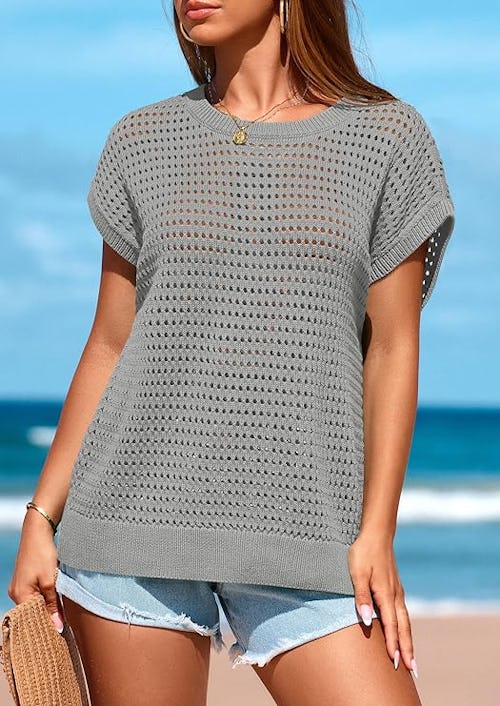 For beach days and ski lodge nights, this crochet cap-sleeve sweater can’t be beat. Woven from soft cotton, it’s gentle on skin while its mesh design is airy and breathable. Cap sleeves and a round neck make it easy to wear and style. It has a medium length and a boxy fit. Layer it over a bralette or a simple tank.
