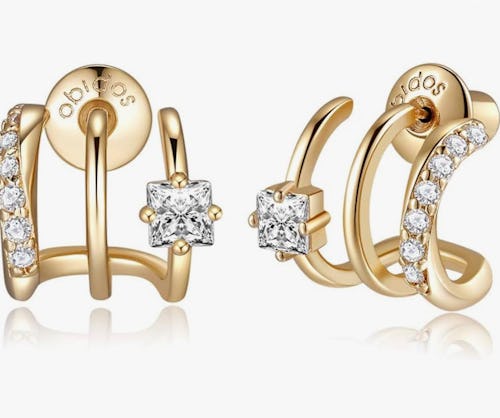 Get a trendy stacked earring look when you wear these posh huggies. The three-hoop design gives the illusion of wearing three separate pairs but with the simplicity of a single piercing. They’re crafted from hypoallergenic brass, plated in real 14-karat gold, and feature twinkling cubic zirconias for an upscale look. Snag them in gold or silver at an incredible price.
