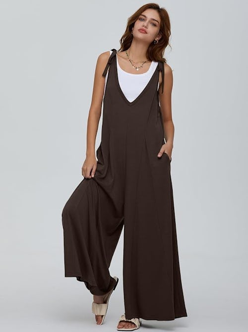 This jumpsuit is the ultimate one-and-done outfit. With tie-shoulder straps, an eye-catching deep V-neck, and breezy wide legs, it’s designed for effortless style and all-day comfort. The flowy rayon/spandex blend moves with you, while the deep pockets keep your essentials close. With loads of styling versatility, this jumpsuit is an instant wardrobe staple.
