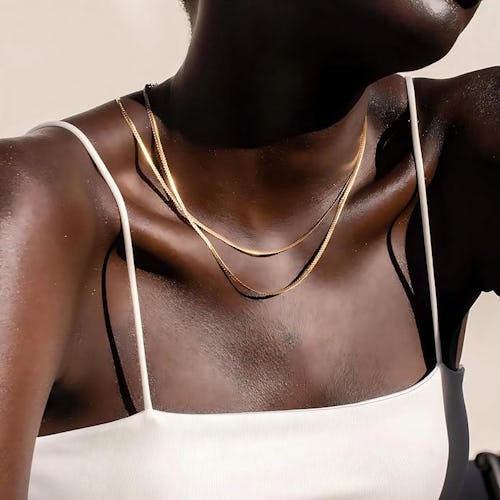 Layering is made effortless with this stunning necklace set available at an wildly low price. It includes three necklaces (Cuban, herringbone, and rope chains) that look great layered or worn separately. And they’re all crafted from 14-karat gold-plated brass for a long-lasting finish that’s tarnish-resistant.