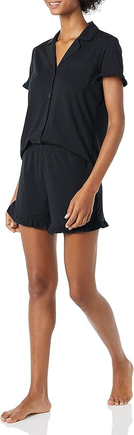 Slip into this ultra-cozy pajama set and instantly feel like you’re lounging in a luxury hotel. Made from a dreamy cotton-modal blend, these are soft, breathable, and just the right amount of stretchy. The notch collar and piped details add a classic touch, while the cute ruffle trim on the shorts keeps things fun.