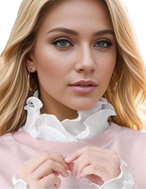 This detachable ruffled dickey and cuff set is your shortcut to vintage elegance — minus the hassle of petticoats and corsets. Featuring delicate textured ruffles and a chic high neckline, these can be layered under blouses, sweaters, or dresses, instantly elevating your look. Crafted from lightweight chiffon, it provides added polish without the bulk of a full shirt.