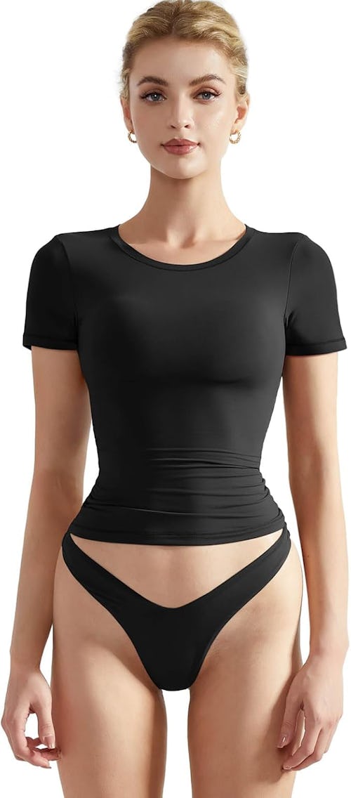 This sleek tee is so versatile that you can pair it with everything from denim bottoms to a silky skirt. It features a classic crewneck design and is made from a soft and stretchy material for a curve-hugging fit. And since it’s double-lined, you’ll never have to worry about your bra playing peek-a-boo. Grab it in so many colors, all at an affordable price.
